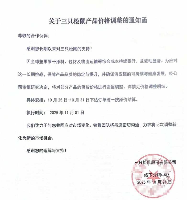 近日,三只松鼠面向经销商发布通知,自11月1日起对35款产品调整供货价格,覆盖坚果、炒货、果干等品类。